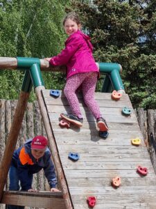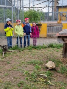 Warm und wetterfest angezogen, stiegen wir am 24.05.22 in unseren Schulbus. Nach der 20 minütigen Fahrt setzte uns Herr Korbacher heil und sicher vor den Toren des Tiererlebnisparkes ab. Wir waren sehr gespannt, was sich seit unserem letzten Besuch verändert hat und welche Tiere wir entdecken werden. Da es zeitiger Vormittag und der Himmel noch grau war, hatten sich viele Tiere noch in ihrer Behausung verkrochen. Aber das sollte sich ganz schnell ändern, als die Sonne sich dann endlich zeigte. Unsere Tierbeobachtungen wurden immer wieder unterbrochen— wir erstürmten alle Spielplatzmöglichkeiten, die sich ergaben!!!!! Die Zeit verging wie im Fluge und plötzlich war es Mittag. Wir bestellten uns Pommes und Nuggets. Bis zur Abfahrt verbrachten wir die letzten Minuten ??? Richtig! Auf einem Spielplatz!